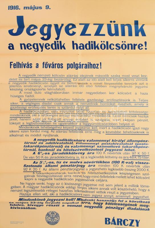 1916 Jegyezzünk hadikölcsönt nagy méretű fővárosi plakát. Hajtva, néhá... https://www.darabanth.com/hu/493-Gyorsarveres/493.0/Mutargy-papirregiseg-egyeb/Militaria~1500009/1916-Jegyezzunk-hadikolcsont-nagy-meretu-fovarosi-plakat-Hajtva-nehany-kisebb-szakadas-a~II3381130