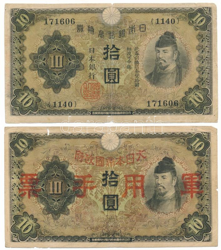 Japán 1930. 10Y + Kína / Japán megszállás 1938. 10Y T:F,VG Japan 1930.... https://www.darabanth.com/hu/493-Gyorsarveres/493.0/Numizmatika/Kulfoldi-bankjegyek~2000015/Japan-1930-10Y-plus-Kina-Japan-megszallas-1938-10Y-T-F-VG-Japan-1930-10-Yen-plus-China-Japanese~II3383635