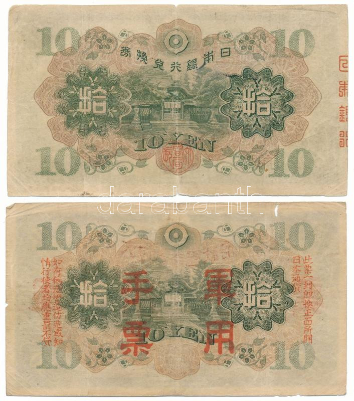 Leírás: Japán 1930. 10Y + Kína / Japán megszállás 1938. 10Y T:F,VG Japan 1930. 10 Yen + China / Japanese occupation 1938. 10 Yen C:F,VG Krause P#M27, P#40