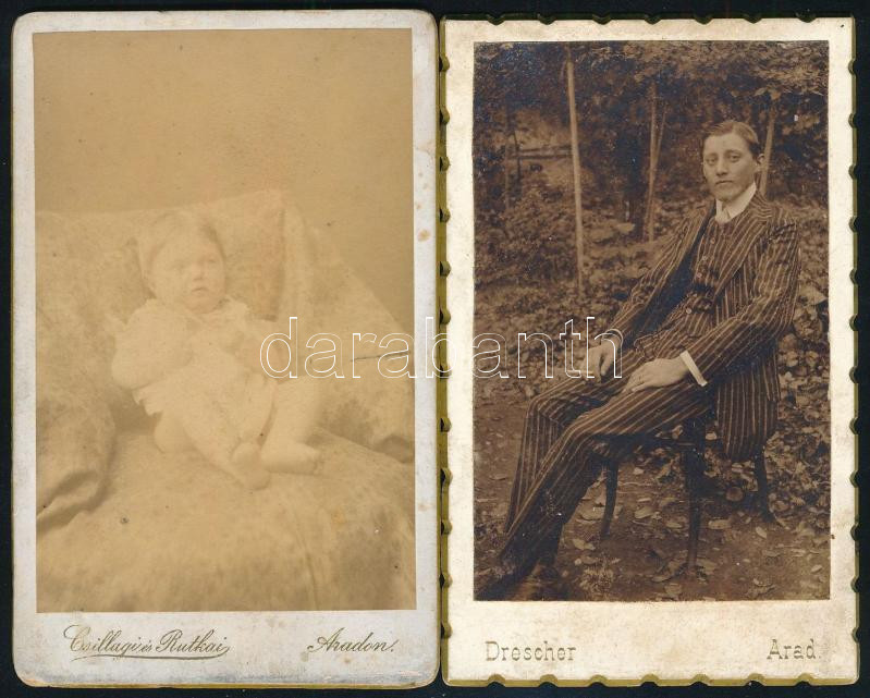 cca 1890-1900 Csecsemő (kisbaba) és fiatal férfi portréja, 2 db keményhátú fotó Drescher valamint Csillagi és Rutkai aradi műterméből, kissé kopott, karton foltos, 10,5×6,5 cm körüli méretben