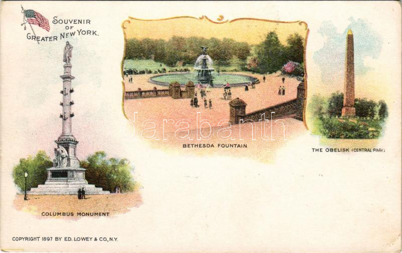 Leírás: New York City, Bethesda Fountain, Columbus Monument, The Obelsik (Central Park). Copyright 1897 by Ed. Lowey & Co. Art Nouveau (EK)