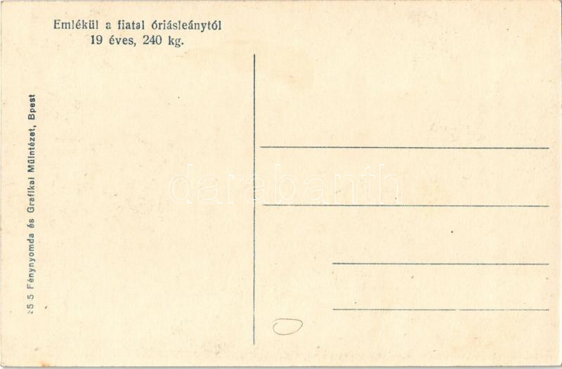 Emlékül a fiatal óriásleánytól - 19 éves 240 kg https://www.darabanth.com/hu/496-Gyorsarveres/496.0/Kepeslapok/Cirkusz~2500066/Emlekul-a-fiatal-oriasleanytol-19-eves-240-kg~II3280304