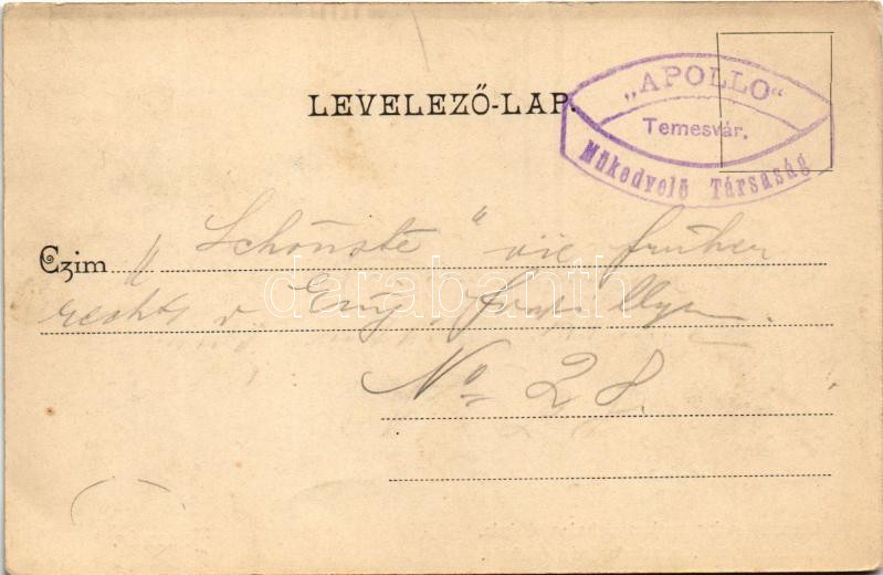1908 Temesvár, Timisoara; Cs. és kir. gyalogsági hadapródiskola, férfi kerékpárral. Králicsek Béla kiadása / Kais. u. Königl. Infanterie-Kadettenschule / K.u.K. military infantry cadet school, man with bicycle + "Apollo Műkedvelő Társaság Temesvár" (EK)