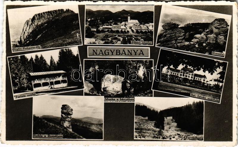 1943 Nagybánya, Baia Mare; Gutin-Kakastarély, Fő tér, Rozsály, Turista szálló, Munka a bányában, Szent István szálloda, Szikla a Rozsályon, Forrásliget / mountain, main square, tourist hotel, gold mine, hotel
