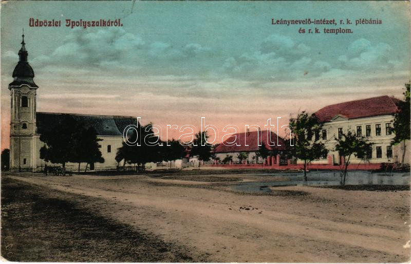 1911 Ipolyszalka, Ipoly-Szalka, Salka; Leánynevelő intézet, római katolikus templom és plébánia. Pummerschein György kiadása / girls' boarding school, Catholic church and parish (ázott sarkak / wet corners)