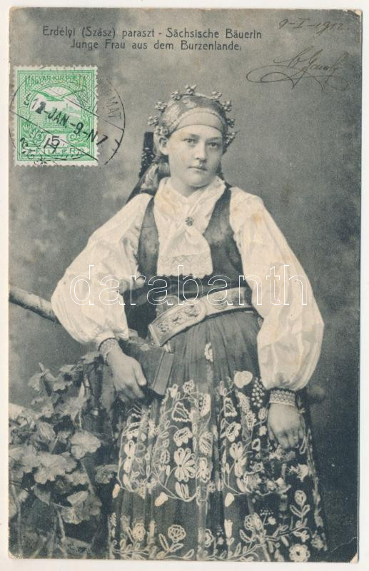 1912 Erdélyi szász parasztasszony, erdélyi folklór. Honi ipar, Bpest B... https://www.darabanth.com/hu/496-Gyorsarveres/496.0/Kepeslapok/Folklor~2500072/1912-Erdelyi-szasz-parasztasszony-erdelyi-folklor-Honi-ipar-Bpest-B-H-20-sz-Transylvani~II3373563