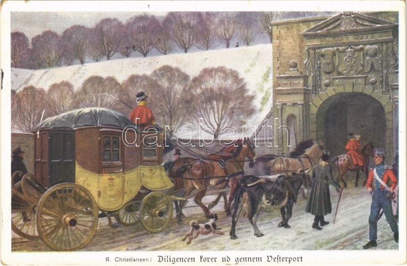 Leírás: 1938 Hestene skiftes uden for en landevejskro. Dansk Post- og Telegrafmuseum Kobenhavn / Danish folklore, post coach s: R. Christiansen (EK)