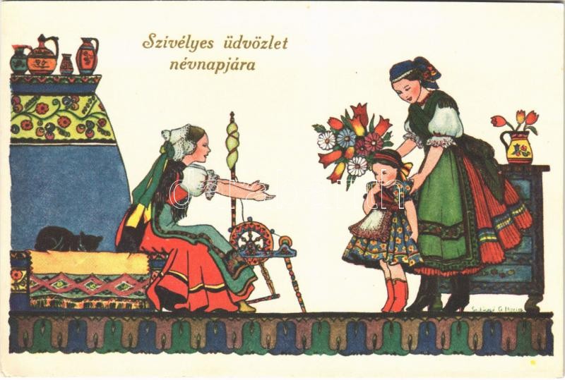 Leírás: Szívélyes üdvözlet névnapjára! Magyar folklór művészlap / Hungarian folklore art postcard with Name Day greeting s: Szilágyi G. Ilona