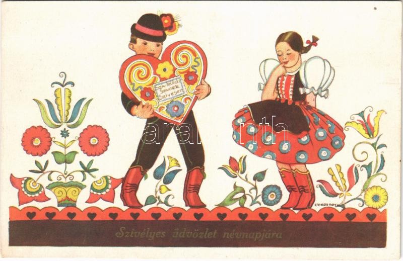 Leírás: Szívélyes üdvözlet névnapjára! Magyar folklór művészlap / Hungarian folklore art postcard with Name Day greeting s: Csikós Tóth