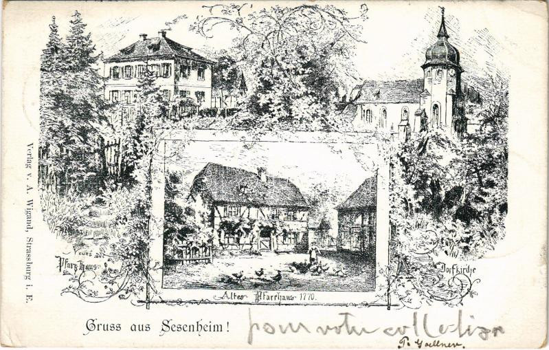 Leírás: 1899 (Vorläufer) Sessenheim, Sesenheim; Pfarrhaus, Altes Pfarrhaus 1770, Dorfkirche / parish, church. Art Nouveau, floral (small tear)