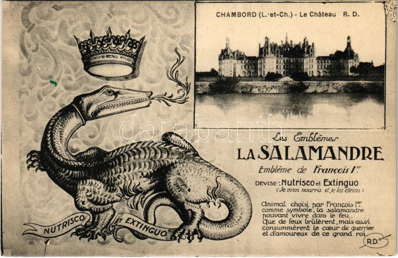 Chambord, Le Chateau, La Salamandre emblema de Francois I. / castle, F... https://www.darabanth.com/hu/496-Gyorsarveres/496.0/Kepeslapok/Franciaorszag~2500029/Chambord-Le-Chateau-La-Salamandre-emblema-de-Francois-I-castle-Francis-Is-salamander~II2960661