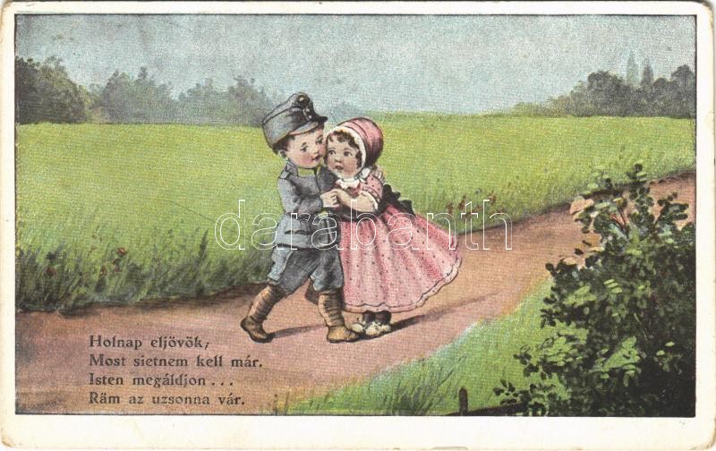 1919 Holnap eljövök... / Children art postcard, romantic couple, soldi... https://www.darabanth.com/hu/496-Gyorsarveres/496.0/Kepeslapok/Gyerek~2500073/1919-Holnap-eljovok-Children-art-postcard-romantic-couple-soldier-boy-LP-5996V-EK~II2451088