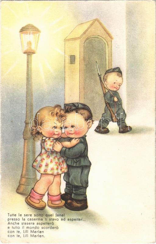 Leírás: 1945 Lili Marlen. Tutte le sere sotto quel fanal... / Italian Children art postcard, boys in military uniforms, romantic couple (EB)