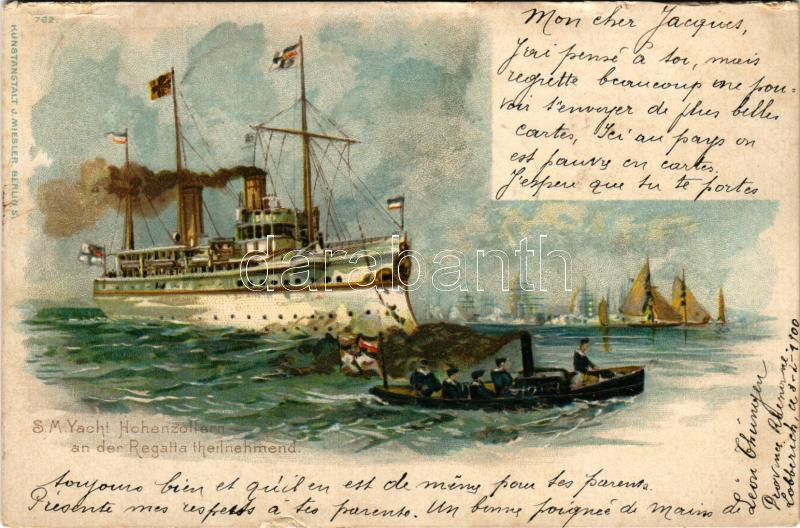 1900 S.M. Yacht "Hohenzollern" an der Regatta theilnehmend. ... https://www.darabanth.com/hu/496-Gyorsarveres/496.0/Kepeslapok/Hadihajo~2500074/1900-SM-Yacht-Hohenzollern-an-der-Regatta-theilnehmend-Kunstanstalt-J-Miesler-762-litho-tear~II3286986