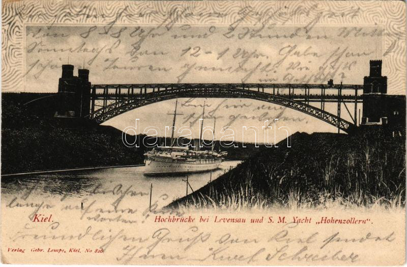 1902 Kiel! Hochbrücke bei Levensan und S.M. Yacht Hohenzollern (EK) https://www.darabanth.com/hu/496-Gyorsarveres/496.0/Kepeslapok/Hadihajo~2500074/1902-Kiel-Hochbrucke-bei-Levensan-und-SM-Yacht-Hohenzollern-EK~II3286956