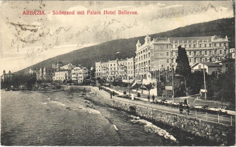 1914 Abbazia, Opatija; Südstrand mit Palace Hotel Bellevue / street vi... https://www.darabanth.com/hu/496-Gyorsarveres/496.0/Kepeslapok/Horvatorszag~2500010/1914-Abbazia-Opatija-Sudstrand-mit-Palace-Hotel-Bellevue-street-view-hotel-EK~II2487263