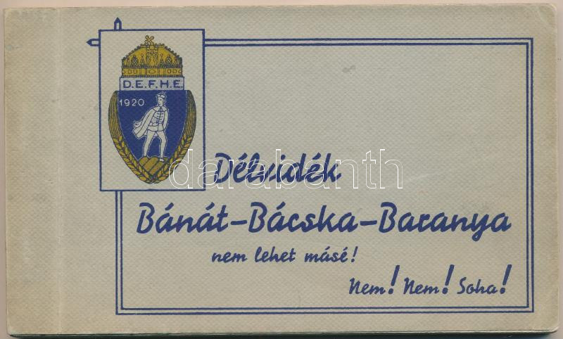 Leírás: Délvidék. Bánát-Bácska-Baranya. Nem lehet másé! Nem! Nem! Soha! Irredenta képeslapfüzet 20 képeslappal. Kiadja a Délvidéki Egyetemi és Főiskolai Hallgatók Egyesülete / Hungarian Southern Land. Irredenta propaganda postcard booklet with 20 postcards s: Lamoss