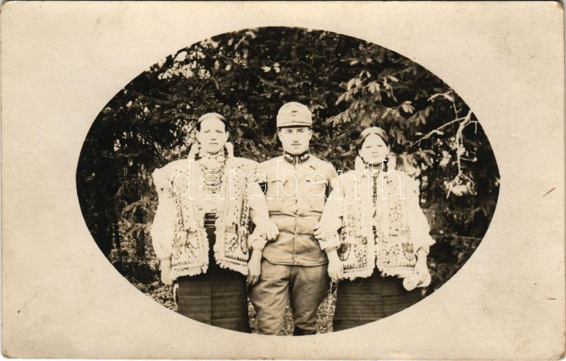 Leírás: Első világháború, román front, gépkocsizó katona csángó lányokkal / WWI Romanian military, soldier with Ceangai girls. photo