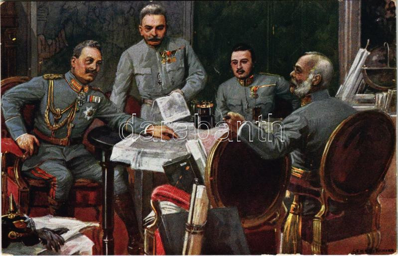 Haditanácskozás Boroszlóban. Vilmos császár, a trónörökös, Frigyes főherceg és Hötzendorfi Conrad / Kriegsrat in Breslau. Kaiser Wilhelm, Erzherzog-Thronfolger, Erzherzog Friedrich und Conrad von Hötzendorf / War Council in Wroclaw. Rotophot Nr. 686. s: Geiger