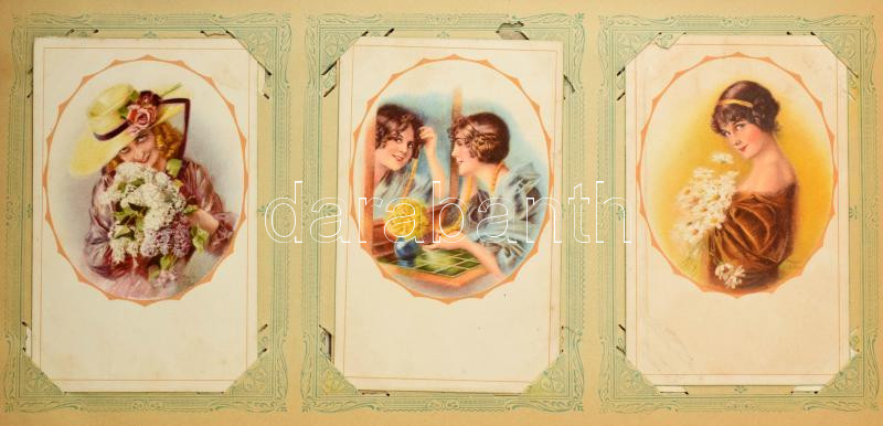 180 férőhelyes régi szecessziós albumban 180 db főleg motívumlap 1899-1944. közötti időszakból, kevés topográfiával, szecessziós lithók, art deco lapok, grafikai lapok, köztük jelzettek, dombornyomású lapok, hölgyek, köztük kézzel díszítettek is, fotólapok, hölgyek, urak, gyerekek, sorozatok, pl: Schützenliesel, Der fidele Bauer sorozat, udvarlás, erotika, párok, tánc, korcsolyázók, gyerek, humor, Bonzó kutya, lovak, macskák, olasz art deco lapok, pl. Chiostri, Bertiglia, Anichini, Castelli, Colombon, jelzett Conway, Doubek, Wallace, Mila Luttich, Barham sorozat, Maxim Trübe lapok, sorozat, színészek, művészlapok stb.