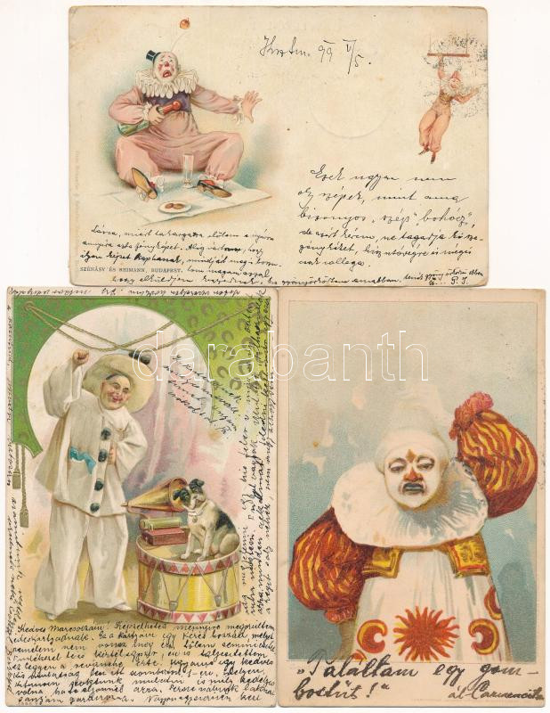 Leírás: 3 db RÉGI (1905 előtti) litho művészlap: bohóc, közte 1 dombornyomott / 3 pre-1905 art postcards: clown, with 1 Emb. litho