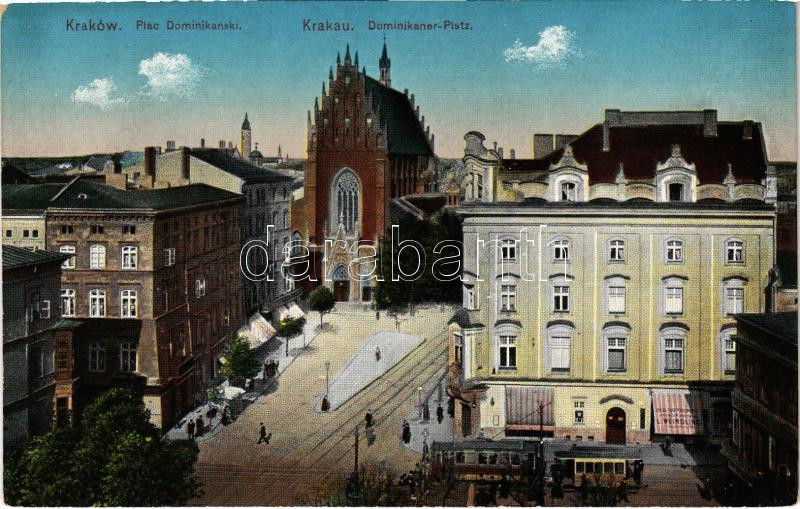 Leírás: Kraków, Krakkó, Krakau; Plac Dominikanski / square, tram, shop of L. Weindling
