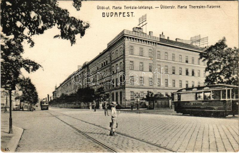 Leírás: 1911 Budapest VIII. Mária Terézia laktanya (1956-ban kivégzett Maléter Pál székhelye volt), Üllői út, villamosok
