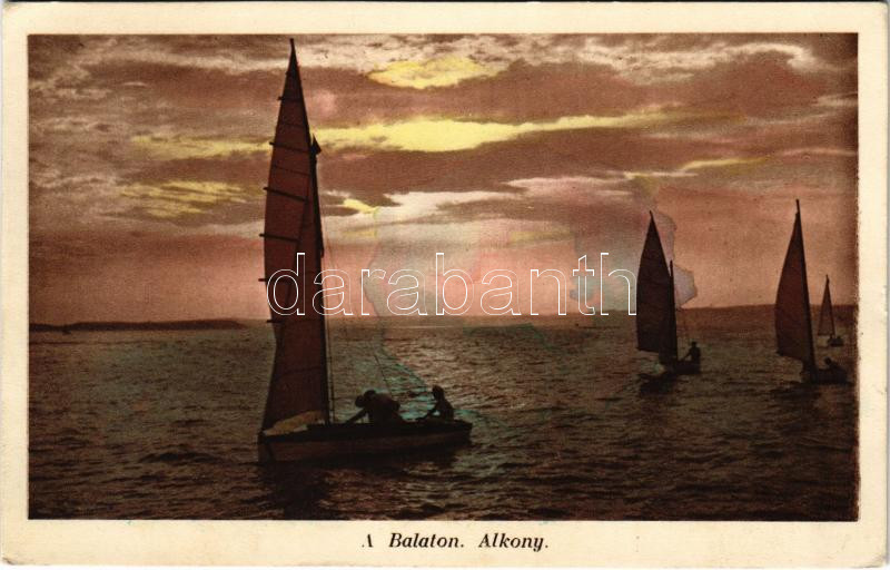 1939 Balaton, vitorlások alkonyatkor (fl) https://www.darabanth.com/hu/496-Gyorsarveres/496.0/Kepeslapok/Magyarorszag~2500005/1939-Balaton-vitorlasok-alkonyatkor-fl~II2991195