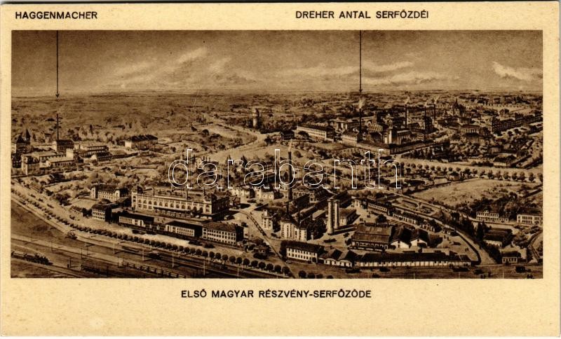 Leírás: Budapest X. Kőbánya, Első magyar részvény-serfőzde; Haggenmacher, Dreher Antal serfőzdéi, sörgyár reklám