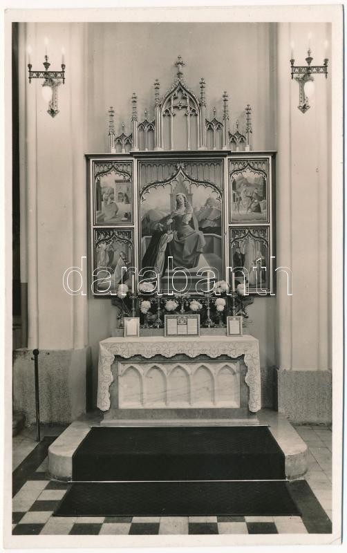Leírás: Budapest XIII. Magdolnavárosi (Béke tér) Plébánia templom, belső, gótikus szárnyas mellékoltár Molnár C. Pál festményeivel