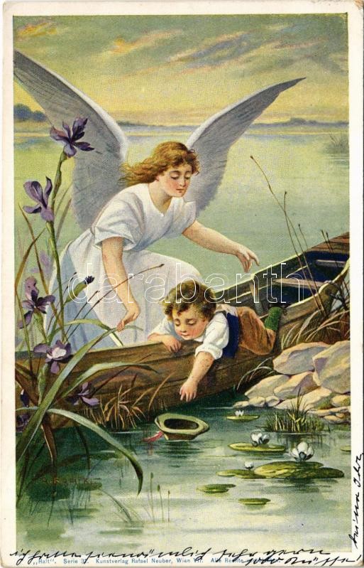Leírás: 1900 "Halt!" Serie 31. Kunstverlag Rafael Neuber / Children art postcard, angel s: R. Kratki (EK)
