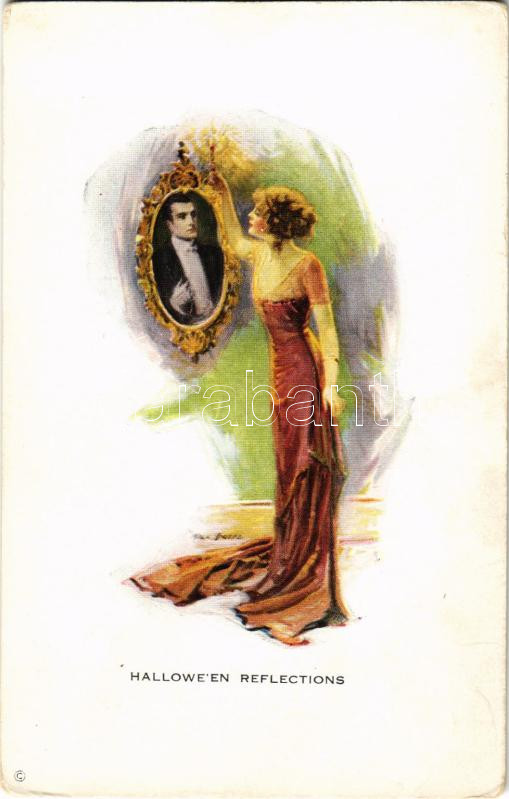 "Halloween Reflections" Lady art postcard, romantic couple. ... https://www.darabanth.com/hu/496-Gyorsarveres/496.0/Kepeslapok/Muveszlapok~2500090/Halloween-Reflections-Lady-art-postcard-romantic-couple-Courtship-Days-Series-952-EK~II2960904