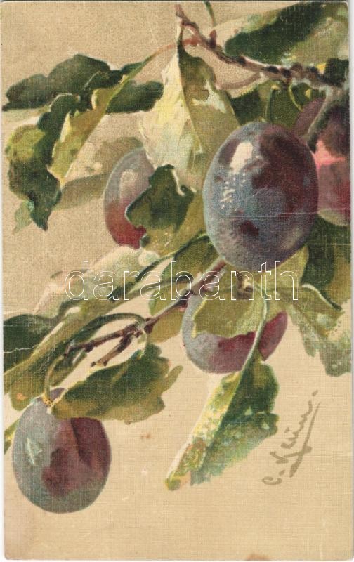 Leírás: Still life art postcard with plum s: C. Klein (gyűrődés / crease)