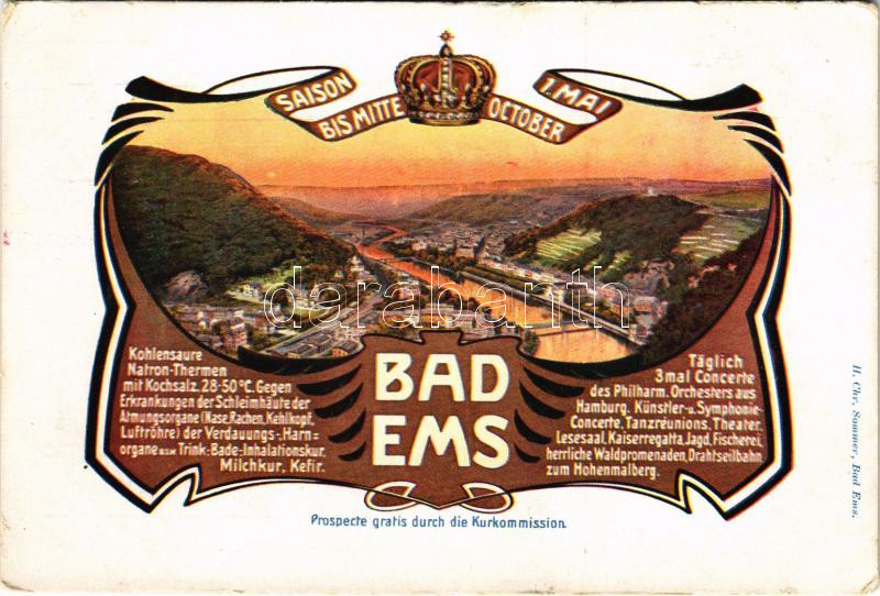 Leírás: Bad Ems, Saison bis mitte October 1. Mai / general view, advertising postcard (EK)