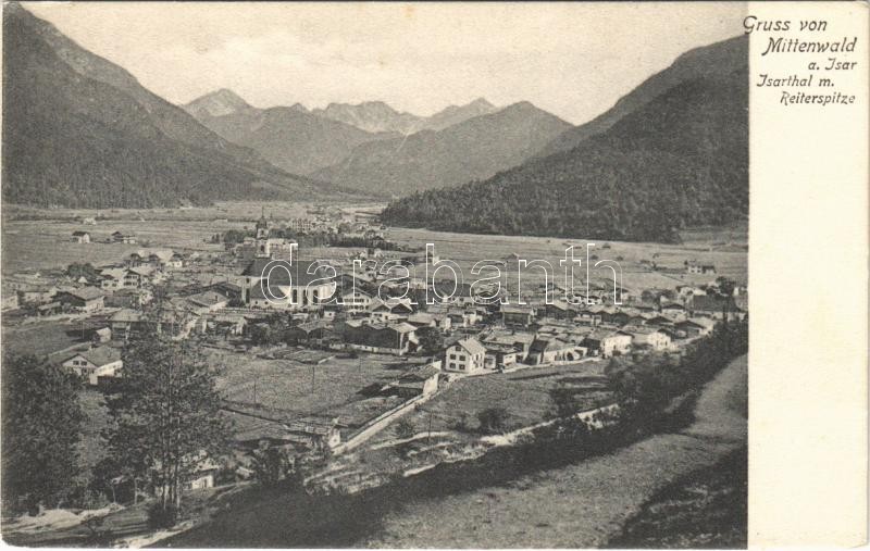 Mittenwald, Isartal m. Reiterspitze / valley, mountains. Verlag v. A. ... https://www.darabanth.com/hu/496-Gyorsarveres/496.0/Kepeslapok/Nemetorszag~2500047/Mittenwald-Isartal-m-Reiterspitze-valley-mountains-Verlag-v-A-Iri-Hofphotograph~II2451493