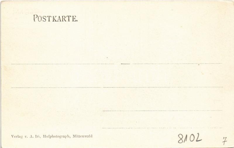 Leírás: Mittenwald, Isartal m. Reiterspitze / valley, mountains. Verlag v. A. Iri, Hofphotograph
