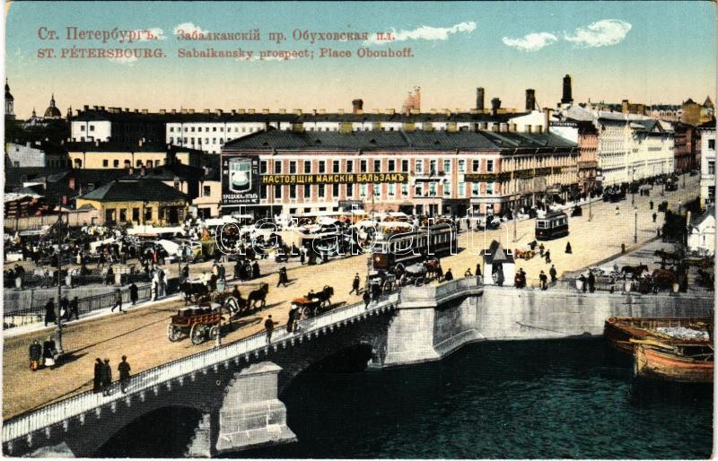 Leírás: Saint Petersburg, St. Petersbourg, Petrograd; Sabaikansky prospect, Place Oubouhoff / street view, tram, market, bridge