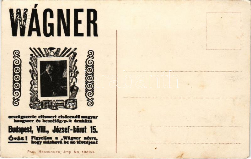 Leírás: Wágner magyar hangszer és beszélőgép áruház reklámja hölgy művészlapon. Paul Heckscher No. 1039/1.