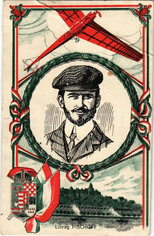 1915 Lovag Pischoff Budapesten, hátoldalon Wágner a "Hangyszerkirály" reklámja / Alfred Ritter von Pischoff aviator in Budapest commemorative postcard, with Hungarian advertisement on the background (fa)