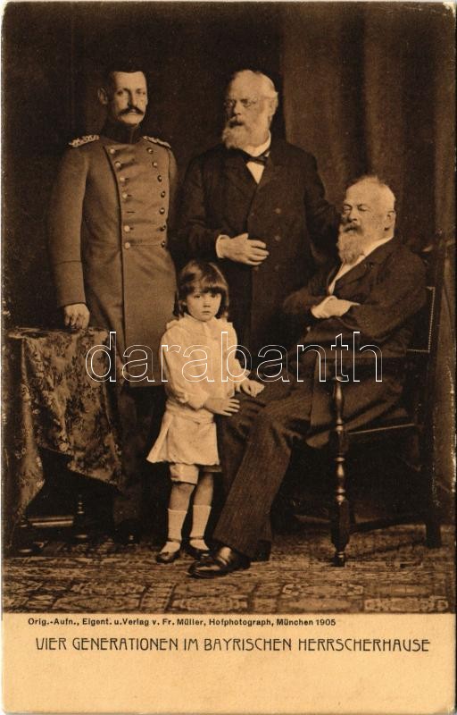 Leírás: Vier Generationen im Bayrischen Herrscherhause. Orig.-Aufn. Eigent. u. Verlag v. Fr. Müller, Hofphotograph München 1905. (EK)