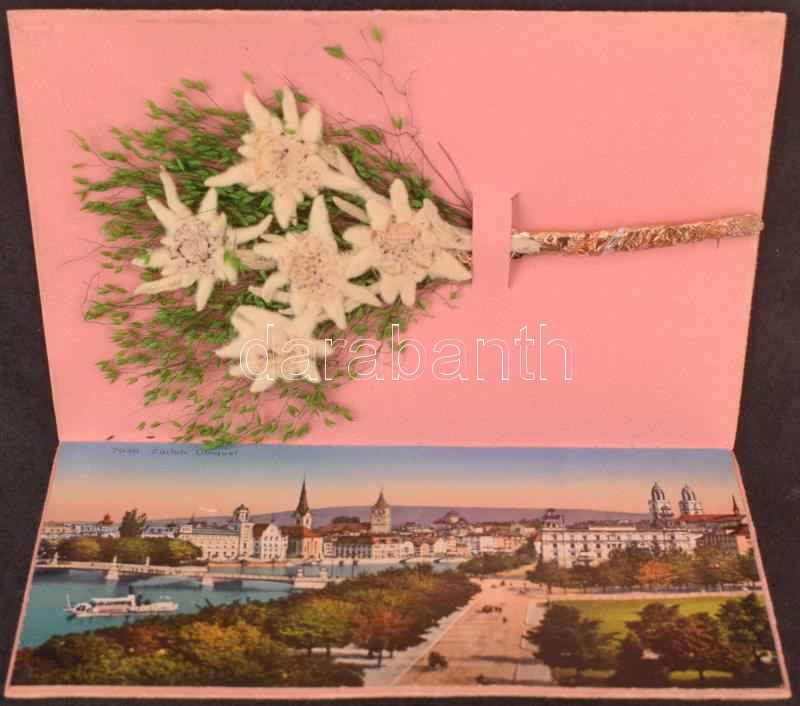 Leírás: Zürich. Edelweiss-Ansichtskarte / Kinyitható svájci képeslap valódi szárított havasi gyopár virággal / Leontopodium alpinum - 2-tiled folding postcard with real dried flower