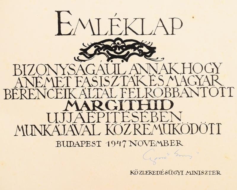 1947 Zádor István (1882-1963): Az ujjáépülÅ‘ MargithÃd. Bp.,1947, Posner, 1 (Emléklap bizonyságul annak, hogy a nlmet fasiszták és magyar bérenceik által felrobbantott MargithÃd ujjáépÃtésében munkájával közreműködött. Rajta GerÅ‘ ErnÅ‘ (1898-1980) közlekedési miniszter (1945-1949) aláÃrásával.) sztl. lev. + 6 p. + 12 t. Zádor István 14 rajza. Kiadói haránt-alakú papÃrkötés, foltos borÃtóval, kijáró füzettel, 2 tábla hiánnyal: 14 rajzzal lenne teljes, 24x31 cm