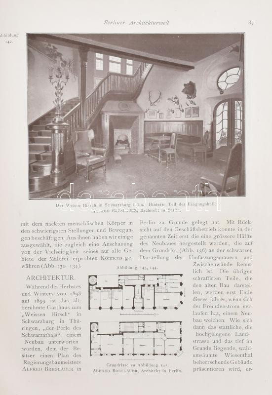 Berliner Architekturwelt: Zeitschrift für Baukunst, Malerei, Plastik und Kunstgewerbe der Gegenwart. Berlin, 1901, Ernst Wasmuth. Kiadói aranyozott egészvászon kötésben, kopott gerinccel és borítóval, intézményi bélyegzőkkel.