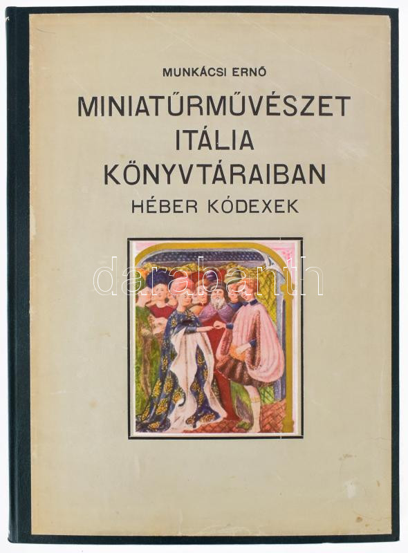Munkácsi Ernő: Miniatűrművészet Itália könyvtáraiban. Héber kódexek. (Bp., 1937), Országos Magyar Zsidó Múzeum,2 sztl. lev.+ 85+(3) p.+ 38 (fekete-fehér képek) t.+ 2 sztl. lev. Egyetlen kiadás. Átkötött egészbőr/műbőr-kötésben, néhány sérült, javított lappal, ex libris-szel.