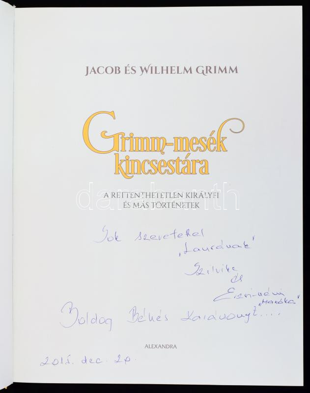 Jacob és Wilhelm Grimm: Grimm-mesék kincsestára. A rettenthetetlen királyfi és más történetek. 2015, Alexandra. Kiadói kartonált kötés, ajándékozási sorokkal, jó állapotban.