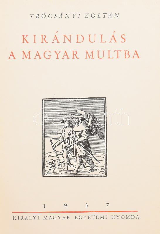 Trócsányi Zoltán: Kirándulás a magyar múltba. (Budapest), 1937. Királyi Magyar Egyetemi Nyomda. 413 + [1] p. + 18 t. Egyetlen kiadás. Trócsányi Zoltán (1886-1971) nyelvész, irodalomtörténész, műfordító. Számos művelődéstörténeti munka szerzője. A tartalomból: Régi magyar élet: Utazások a régi Magyarországon -- Az áldott krumpli -- A magyar bor dicsérete -- Biedermeier illemtan -- Biedermeier báli éjtszaka -- Sorscsapások: Ég a város, ég a ház -- Pestis és kolera -- A koldulás története -- Magyar könyv és nyelv: A könyv sorsa Magyarországon -- A sziklafaltól a mammut-hírlapig -- Régi írások és falusi levelek -- Tollszárak, pipák és egyéb ereklyék. Feliratozott kiadói félbőr kötésben, ajándékozási bejegyzéssel, egy melléklet kijár
