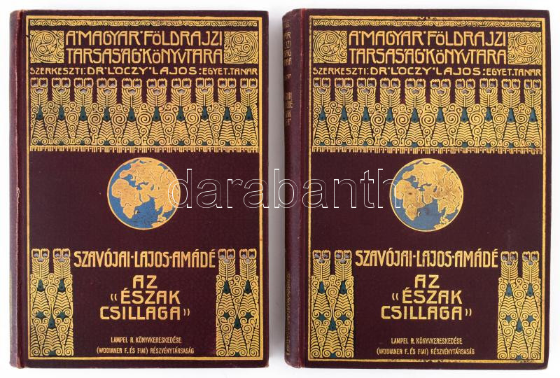 [Lugi Amadeo di Savoia-Aosta, duca degli Abruzzi (1873-1933)] Szavójai Lajos Amádé: Az "Észak csillaga".(,,Stella Polare.") Az Északi sarkitengeren 1899-1900. I-II. kötet. Ford.: Dr. Darvai Móric. Magyar Földrajzi Társaság Könyvtára. Bp.,[1904.], Lampel R. (Wodianer F. és Fiai. Rt.), 1 (címkép) t + 218 p.+18 (fekete-fehér képtáblák) t. ; 199+1 p.+7 (fekete-fehér képtáblák) t. + 2 (térképek, 1 kétoldalas, 1 kihajtható) t. Szövegközti fekete-fehér fotókkal, és térképekkel illusztrált. Kiadói dúsan aranyozott egészvászon kötésben, minimális kopással