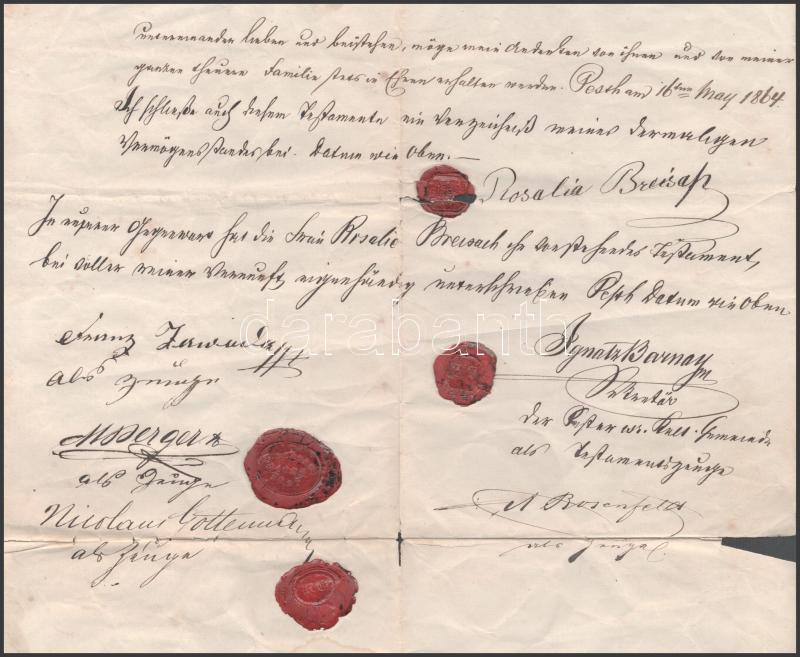1864 Pest, Végrendelet Breisach Rozáliától viaszpecsétekkel, többek kö... https://www.darabanth.com/hu/496-Gyorsarveres/496.0/Kulfoldi-filatelia-es-postatortenet/Okmanyok~1000081/1864-Pest-Vegrendelet-Breisach-Rozaliatol-viaszpecsetekkel-tobbek-kozott-Barnay-Ignac-18~II3387879