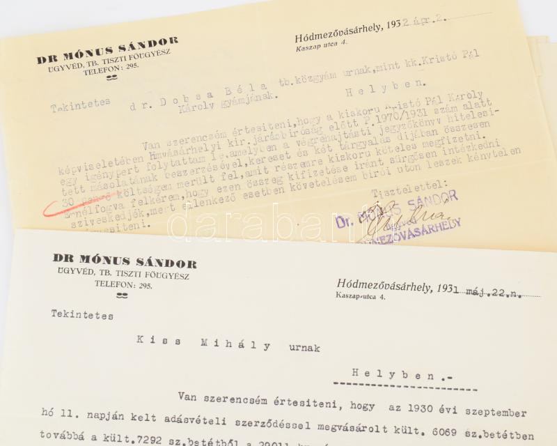 1920-1930, Hódmezővásárhelyi ügyvédi iratok, főleg meghatalmazások. https://www.darabanth.com/hu/496-Gyorsarveres/496.0/Kulfoldi-filatelia-es-postatortenet/Okmanyok~1000081/1920-1930-Hodmezovasarhelyi-ugyvedi-iratok-foleg-meghatalmazasok~II3389179