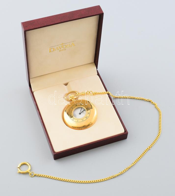 Leírás: Davosa svájci zsebóra, eredeti díszdobozban, lánccal, működik, d: 5 cm